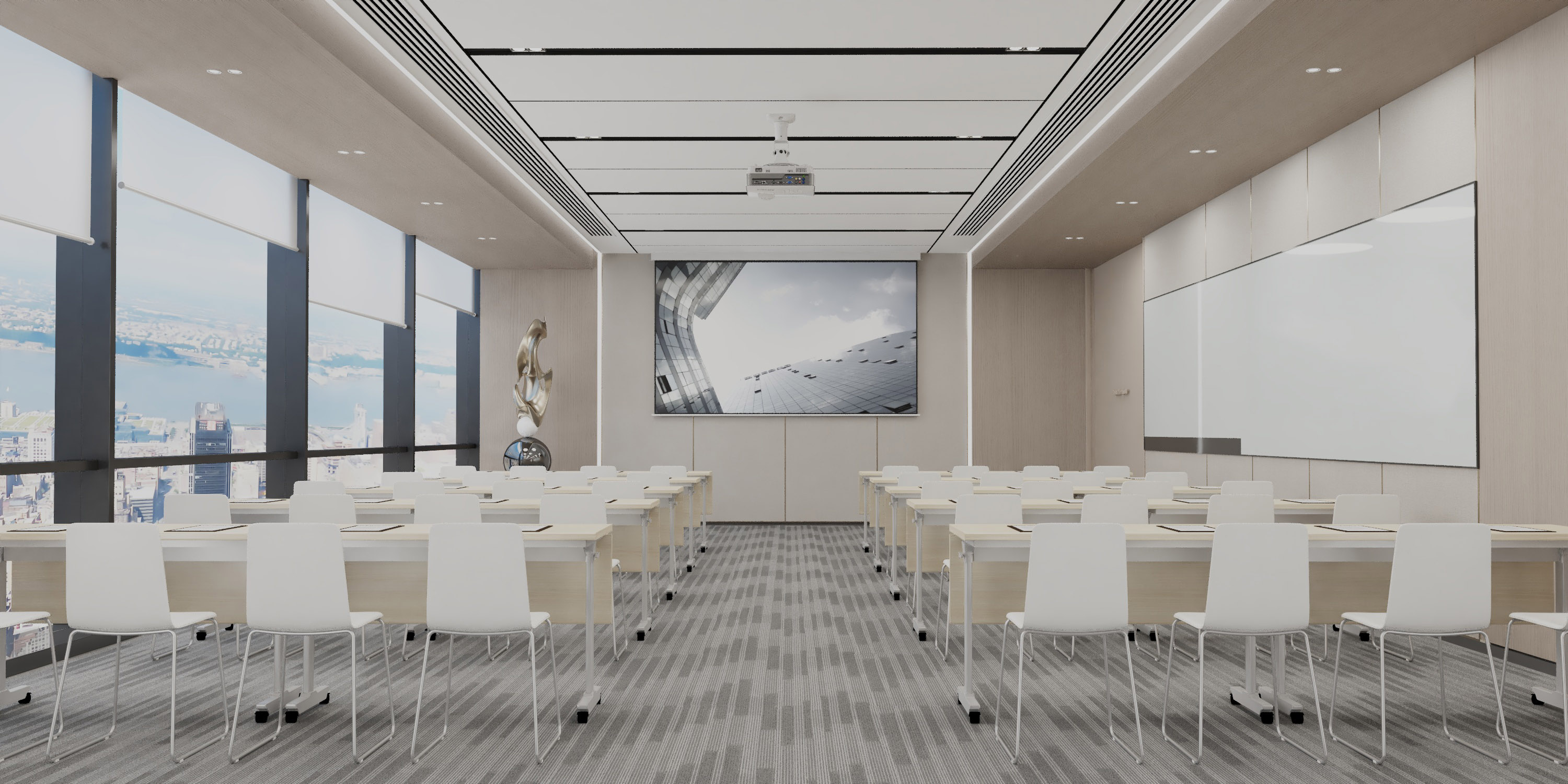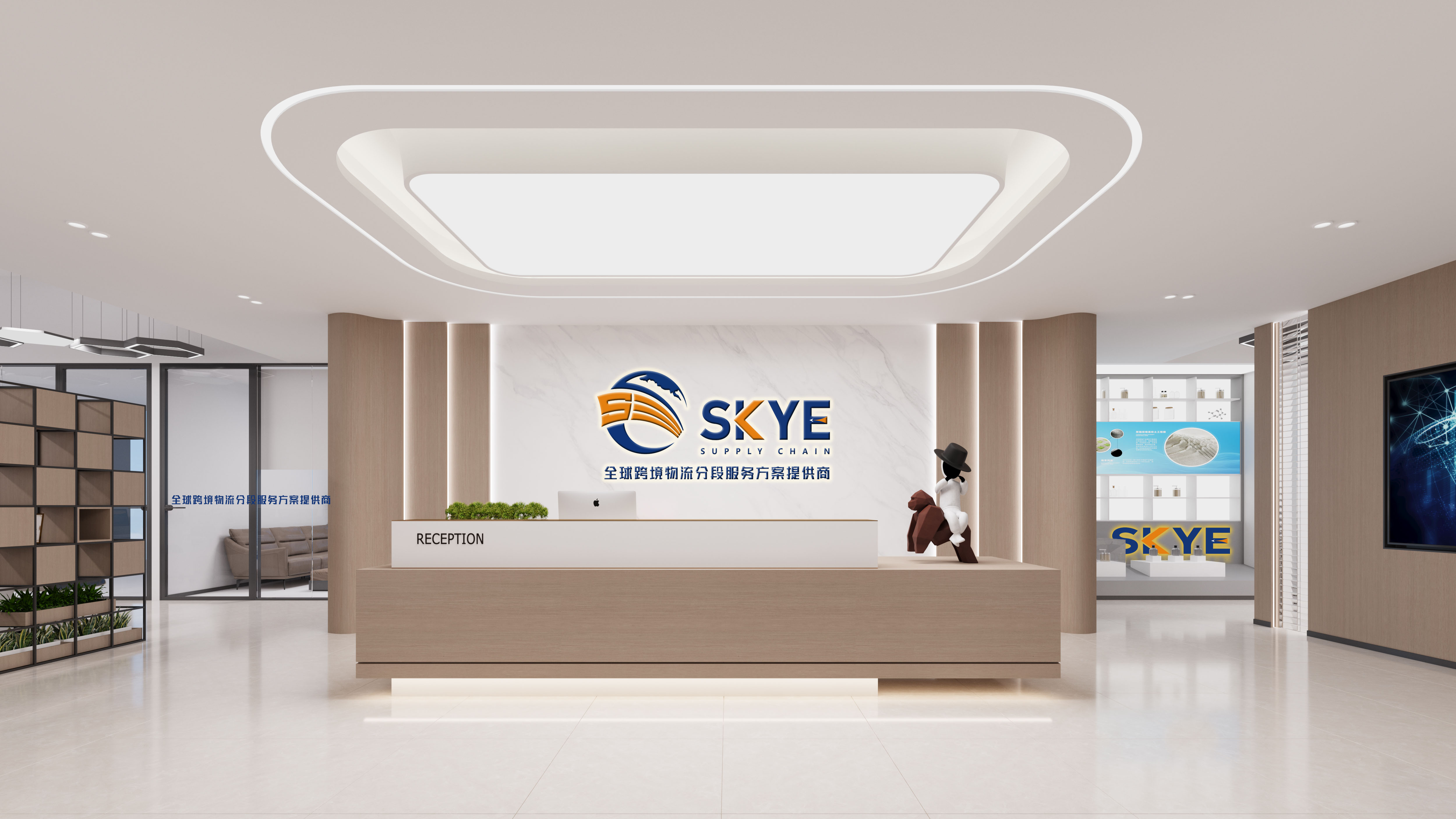 本方案为SKYE供应链打造现代办公空间。前台区域以浅木色与大理石为基调,彰显专业形象,大型吊灯营造明亮氛围。办公区采用简洁米棕色调,配以科技感屏幕与展架,突出公司跨境物流的科技属性。会议室设计注重实用与舒适,深灰会议桌搭配大面积落地窗,采光充足,便于团队高效协作。整体设计融合自然绿植与柔和照明,在专业氛围中注入舒适感,塑造兼具功能性与视觉美感的现代化企业环境。