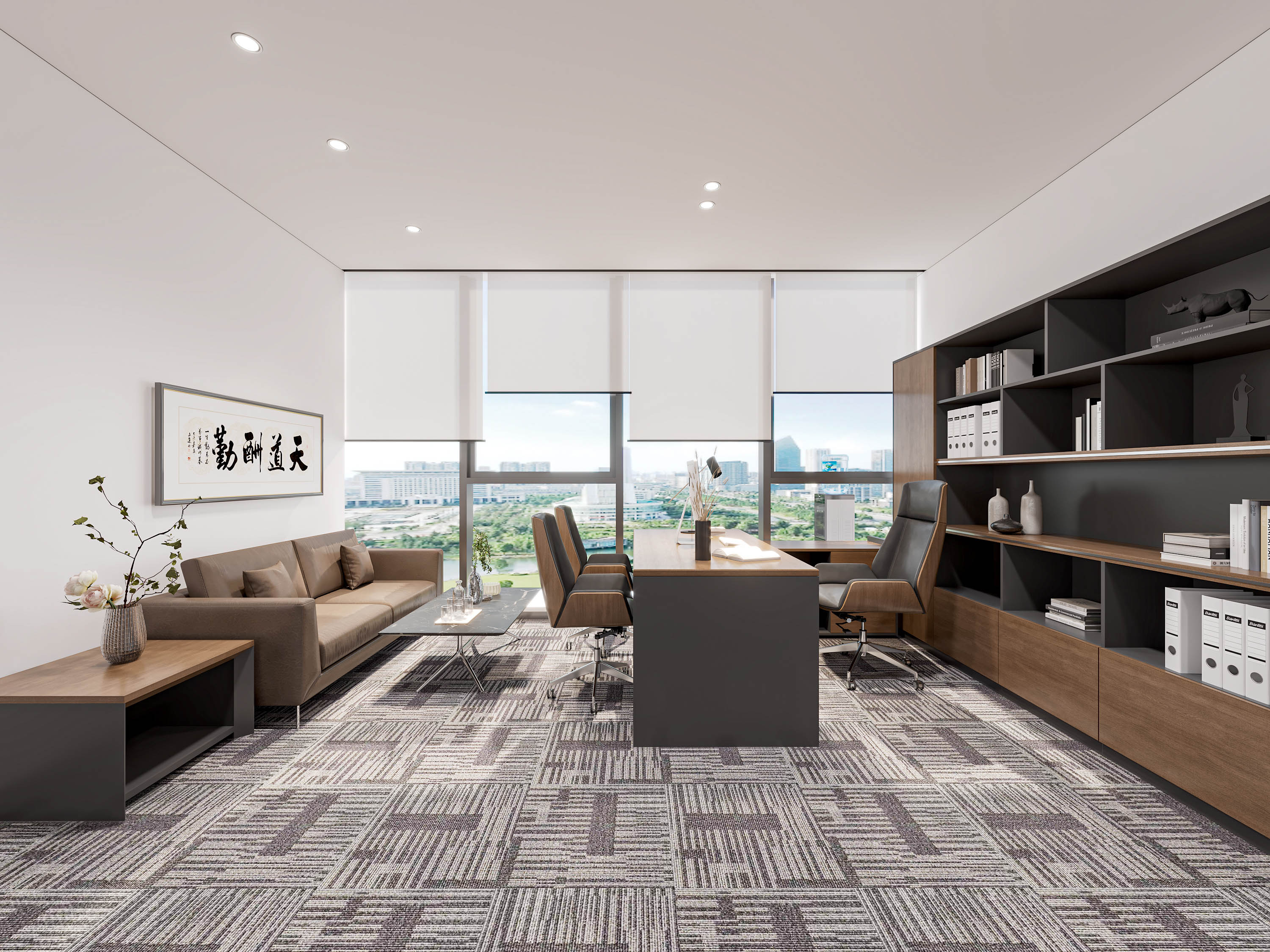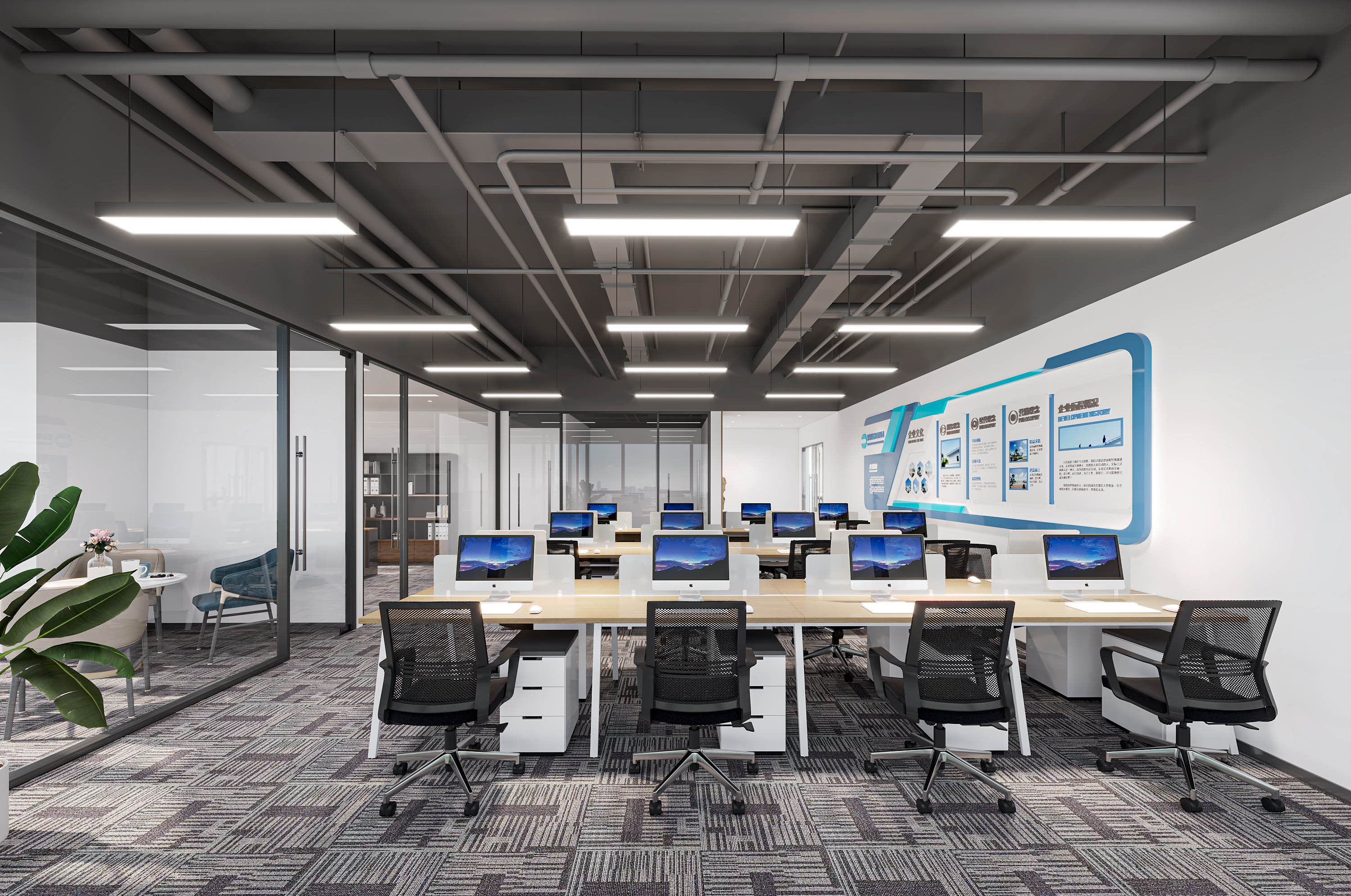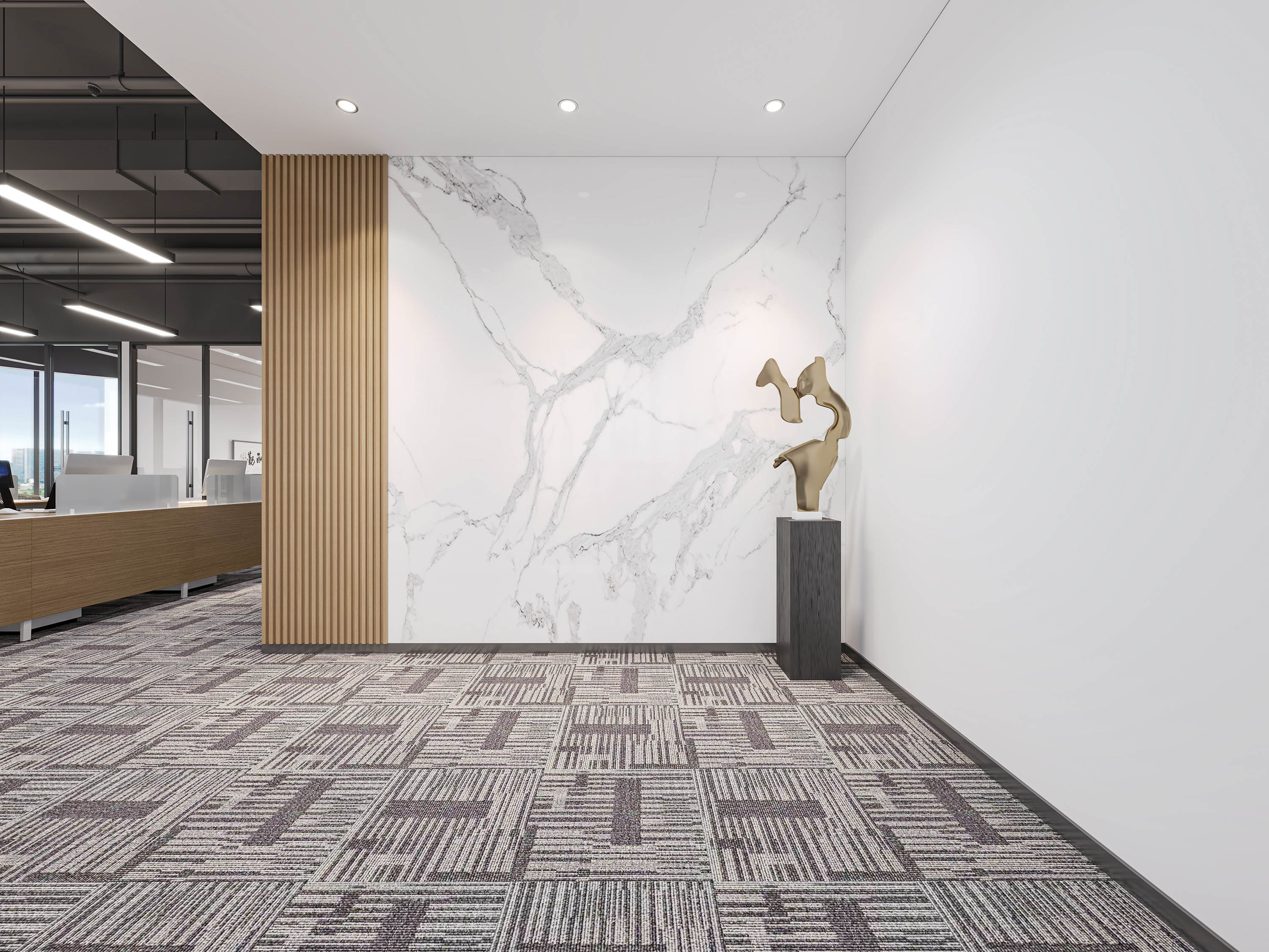 本次办公空间设计,以现代简约为基调。公共区域墙面运用大理石与木质元素,搭配艺术雕塑,营造精致感;开放办公区采用通透玻璃隔断,搭配简洁办公家具,上方长条灯提供充足照明,墙上文化展示墙传递企业理念;独立办公室融合办公与休闲功能,大面积窗户引入自然光线,整体空间通过材质、灯光与布局的搭配,打造出既专业高效又舒适有格调的办公环境。