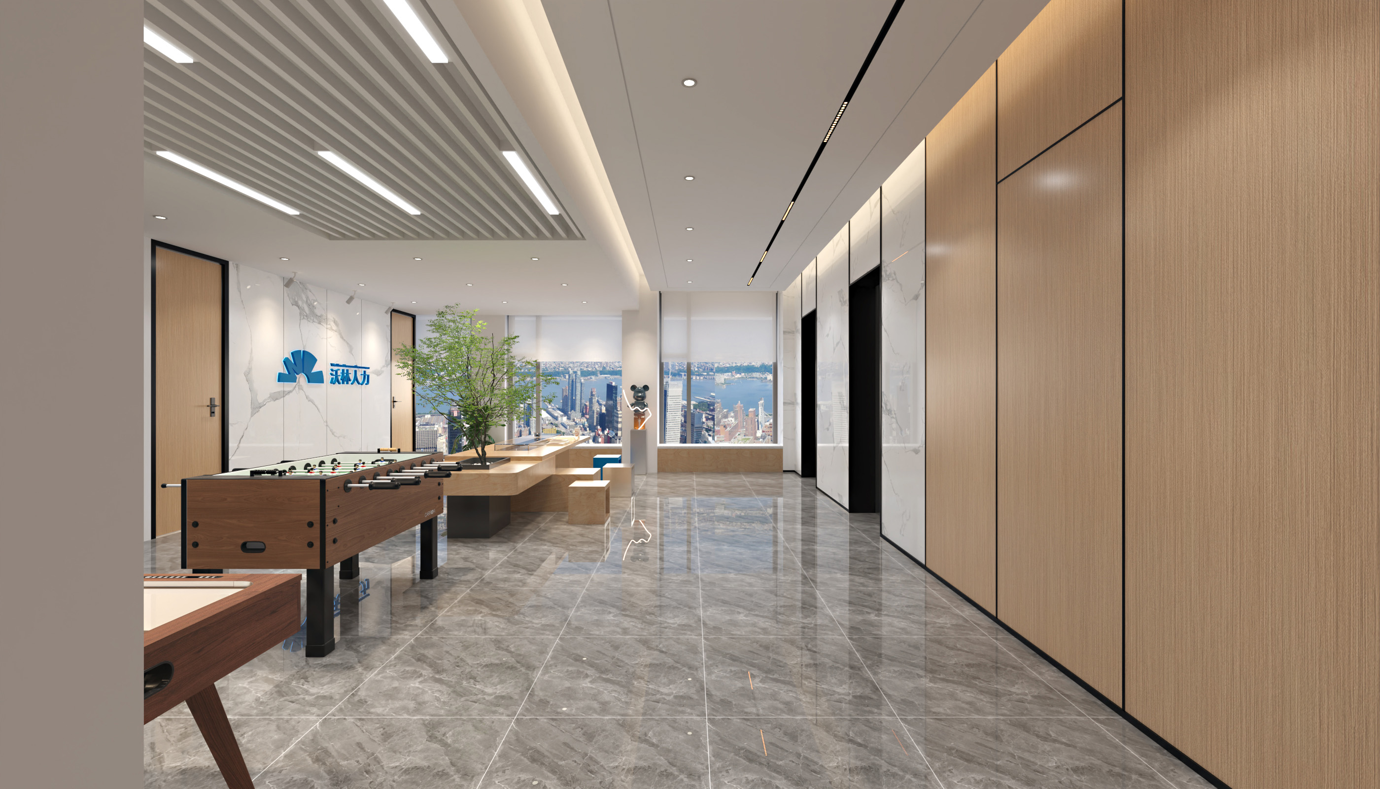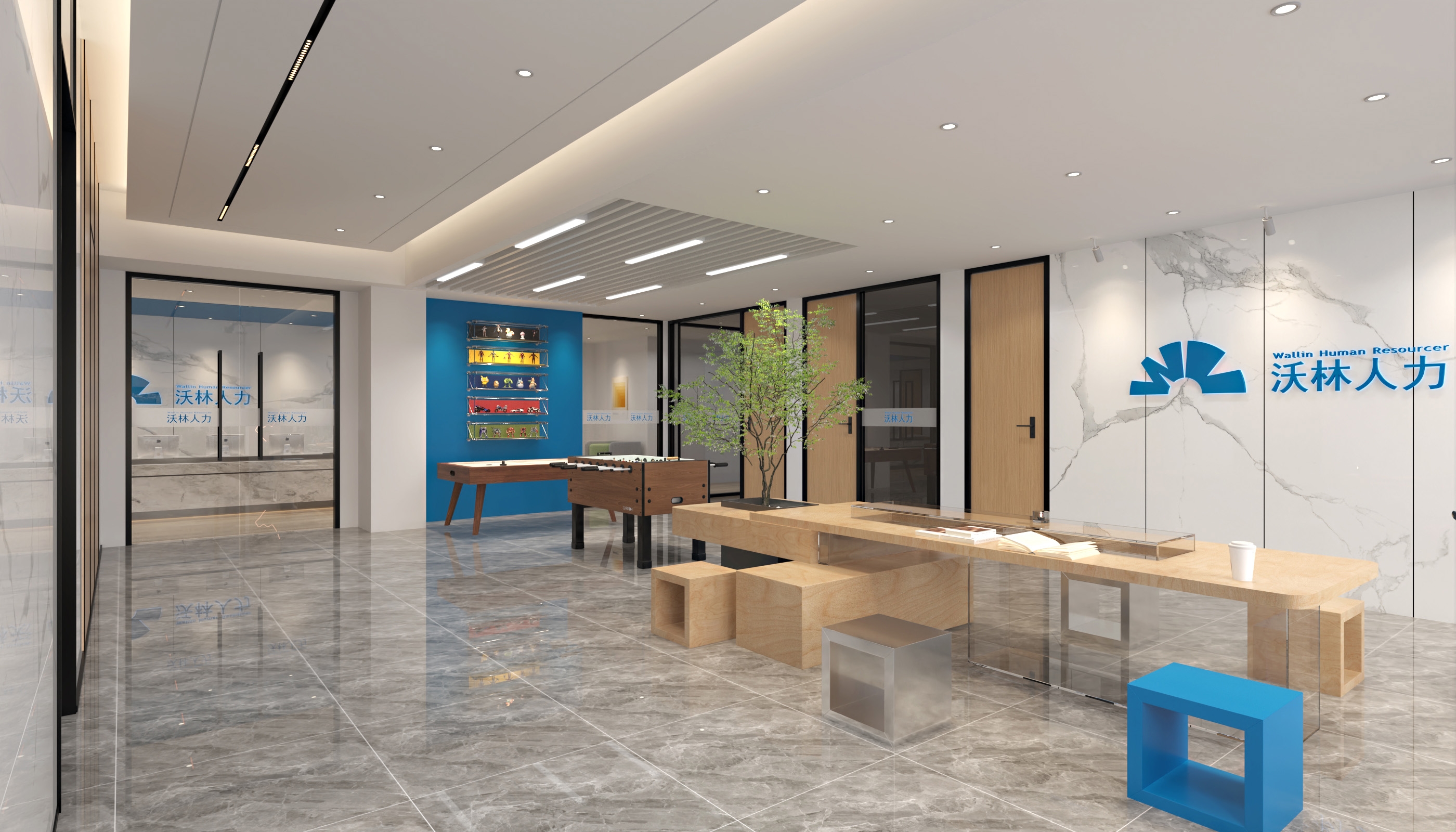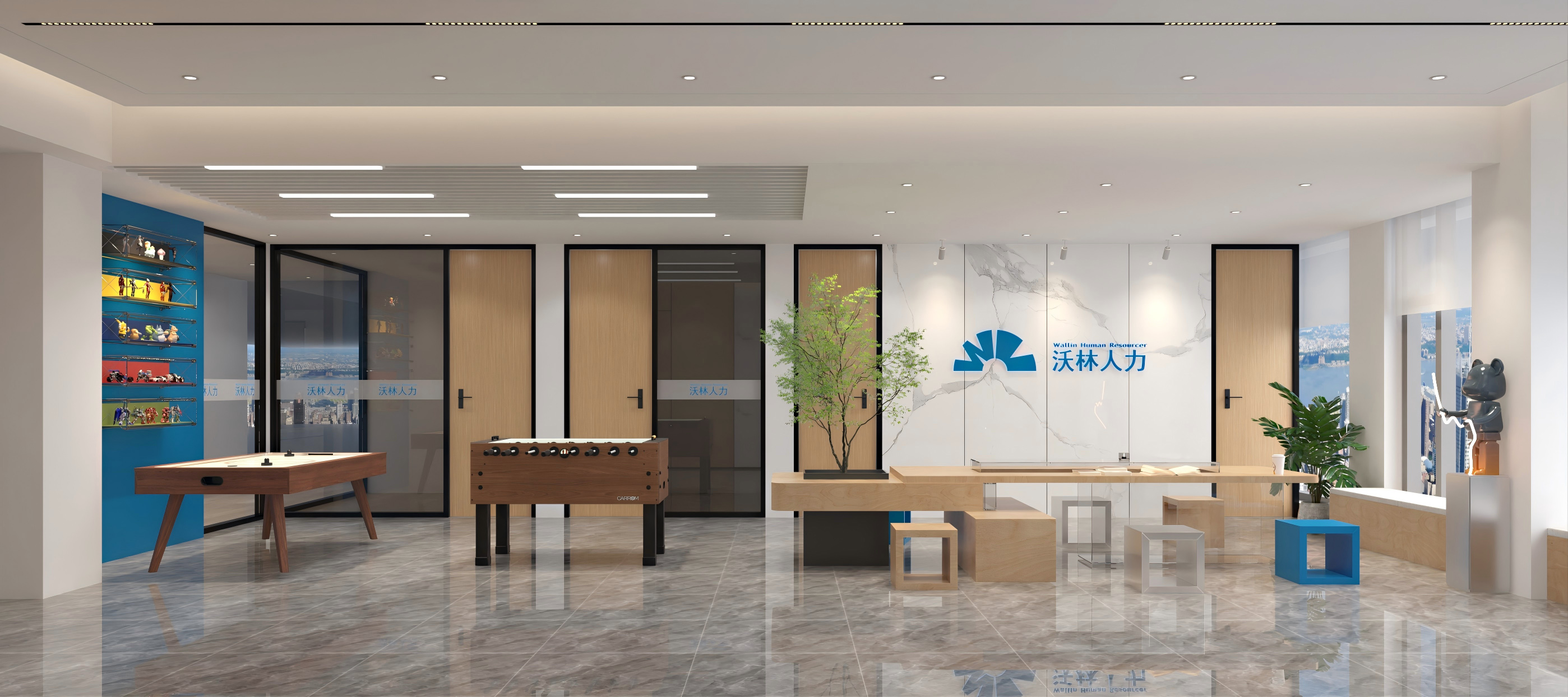 本次沃林人力办公空间设计,以现代简约为基调,融合企业活力与专业感。公共休闲区,运用原木色与蓝色碰撞,搭配桌上足球等设施,营造轻松氛围,助力员工放松交流。墙面陈列的手办展示架,为空间增添趣味与个性。接待区采用简洁的灰白配色,搭配流线型前台与舒适休憩沙发,既体现企业专业形象,又给来访者温暖体验。整体空间通过合理布局与色彩、材质搭配,打造出兼具舒适与高效的办公环境。