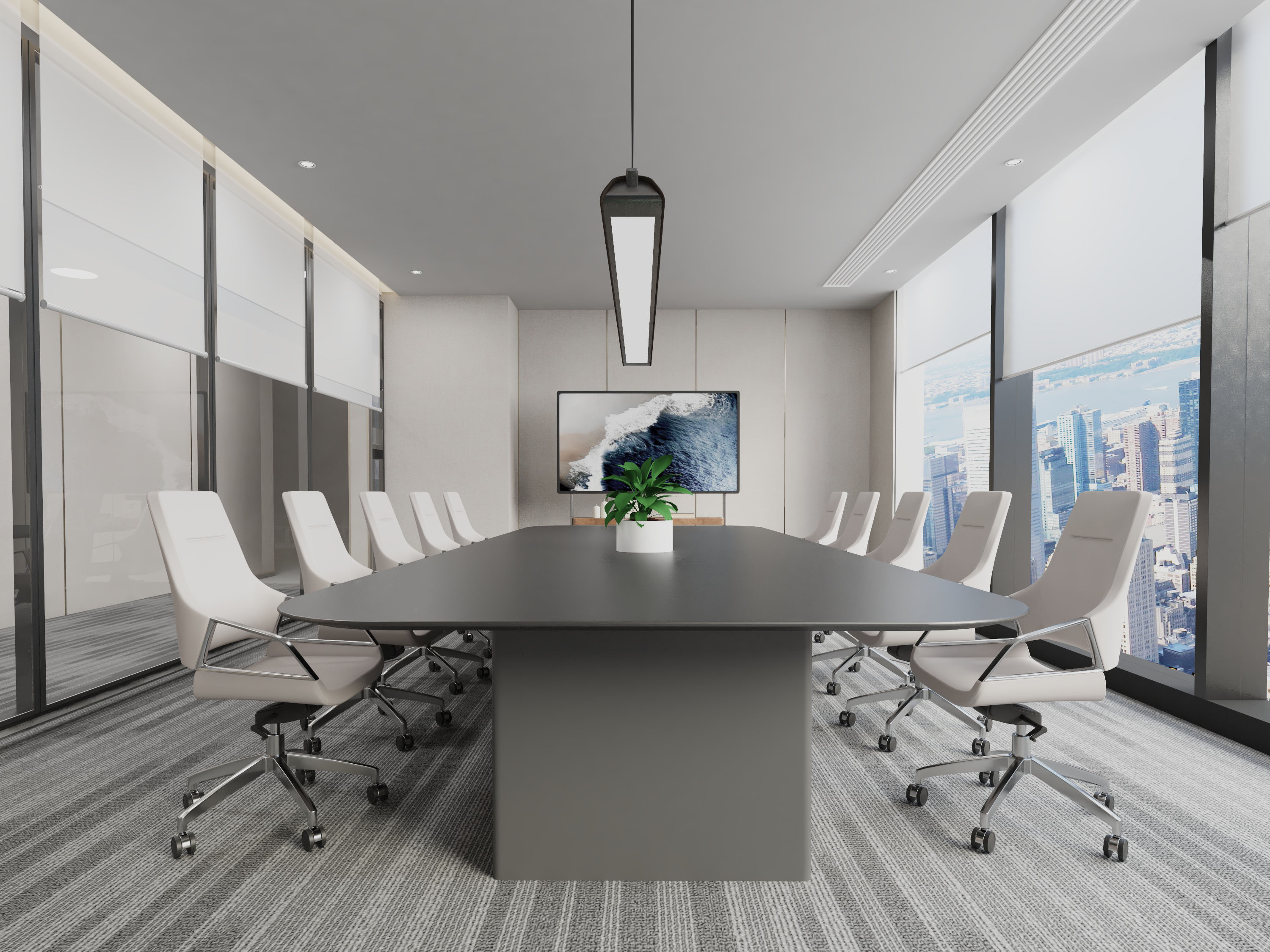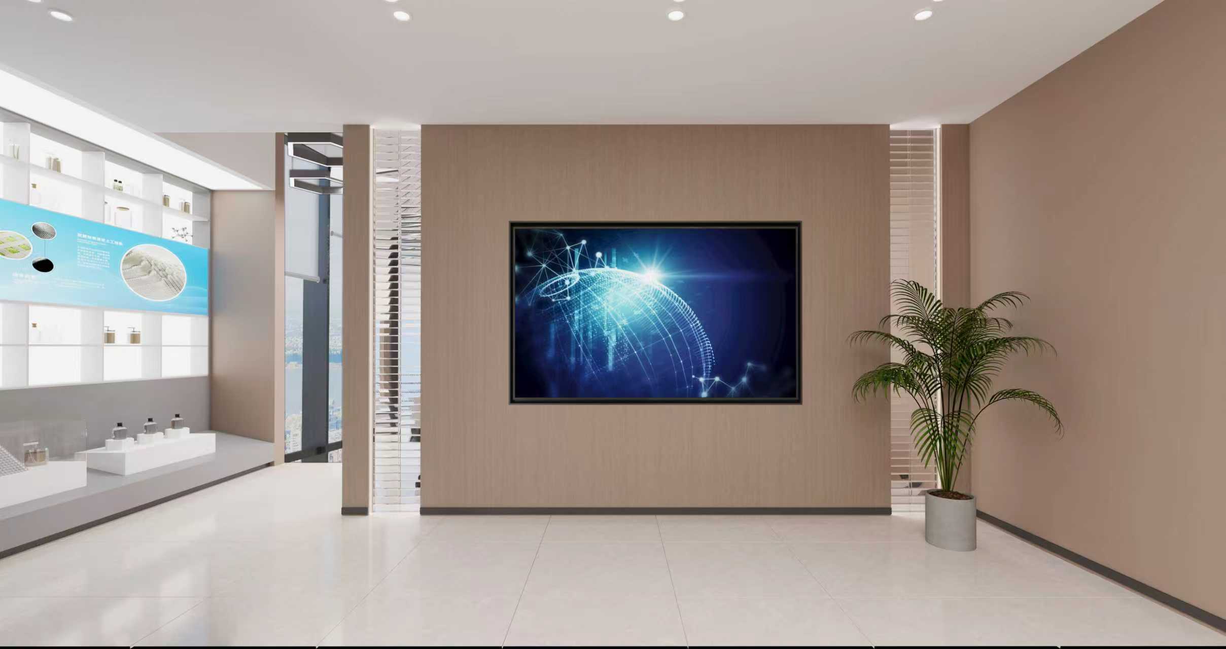 本方案为SKYE供应链打造现代办公空间。前台区域以浅木色与大理石为基调,彰显专业形象,大型吊灯营造明亮氛围。办公区采用简洁米棕色调,配以科技感屏幕与展架,突出公司跨境物流的科技属性。会议室设计注重实用与舒适,深灰会议桌搭配大面积落地窗,采光充足,便于团队高效协作。整体设计融合自然绿植与柔和照明,在专业氛围中注入舒适感,塑造兼具功能性与视觉美感的现代化企业环境。
