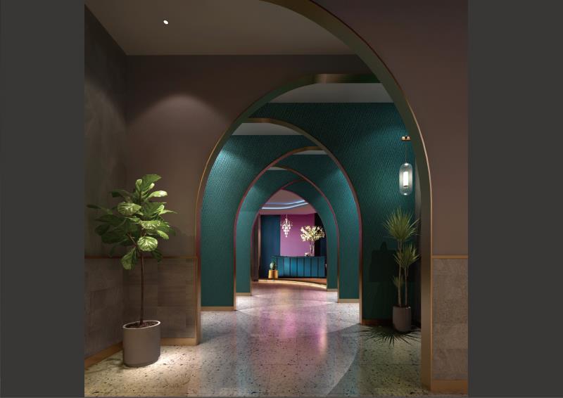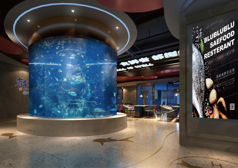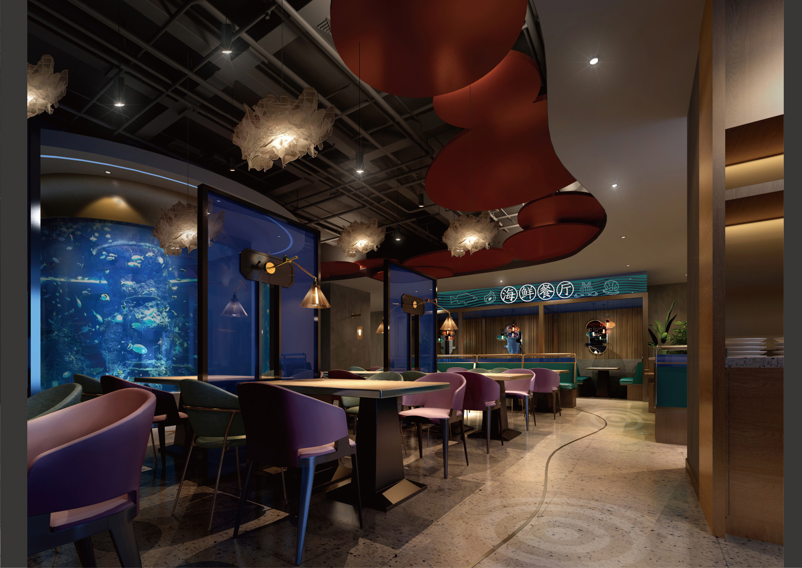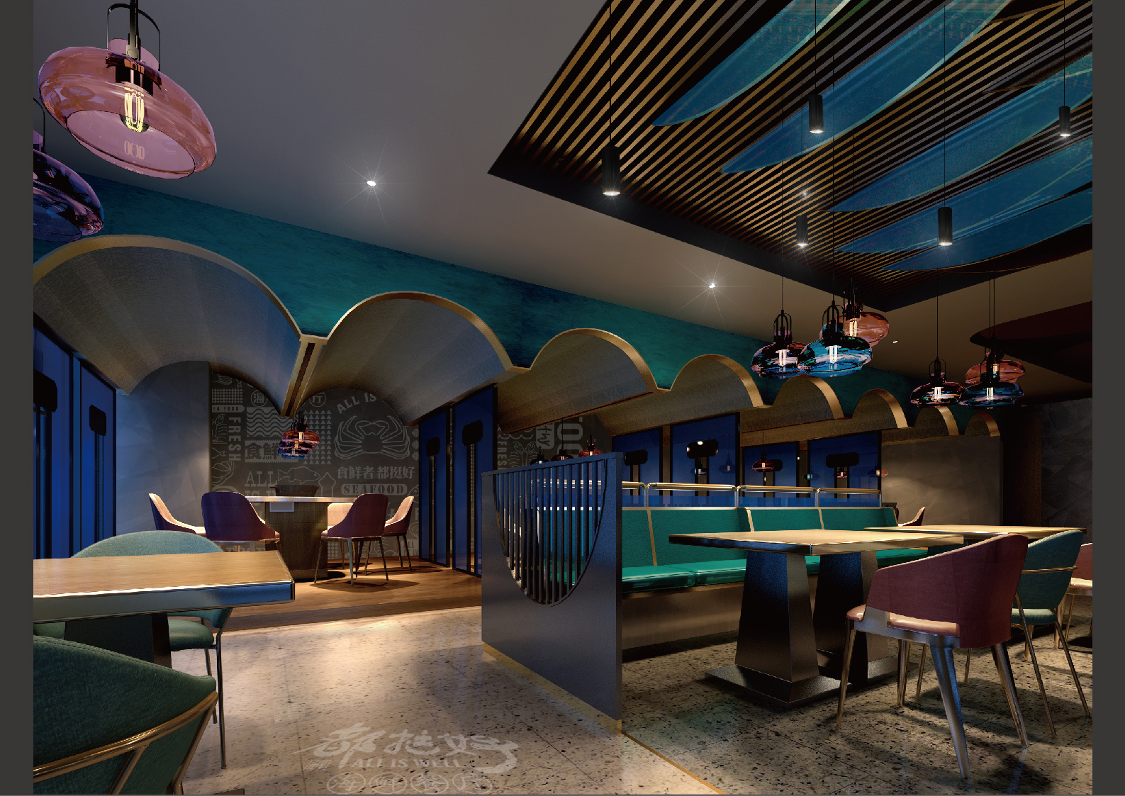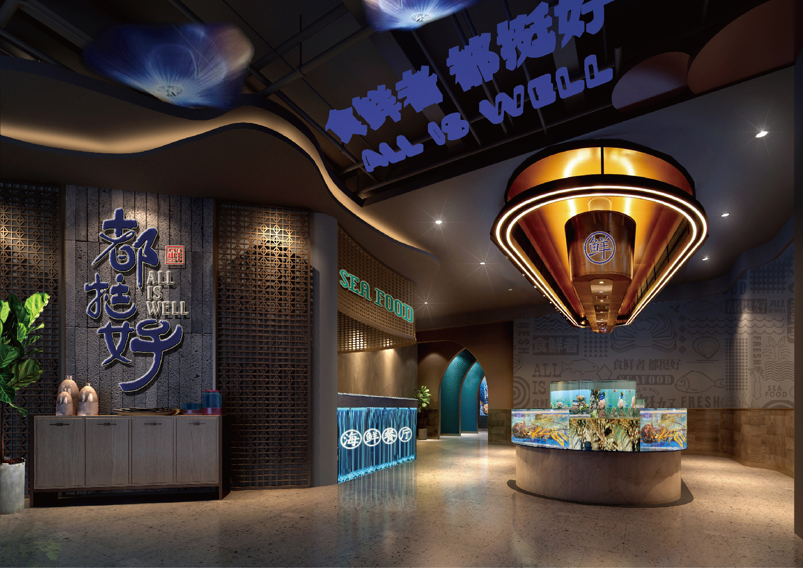 “都挺好”海鲜餐厅设计以海洋主题为灵魂,门头巨型红蟹雕塑吸睛,入口弧形拱门搭配深蓝主调,营造沉浸式海韵氛围。大堂设悬浮水族柱与波浪形吊顶,光影流动如置身海底。用餐区色彩跳跃,紫粉座椅与蓝绿卡座碰撞,搭配鱼形吊灯与弧形隔断,趣味十足。空间融合现代与童趣,墙面海浪纹样、地面鱼影铺装强化主题,整体明亮通透,兼具社交与打卡属性,是“食鲜”与美学共生的餐饮空间。