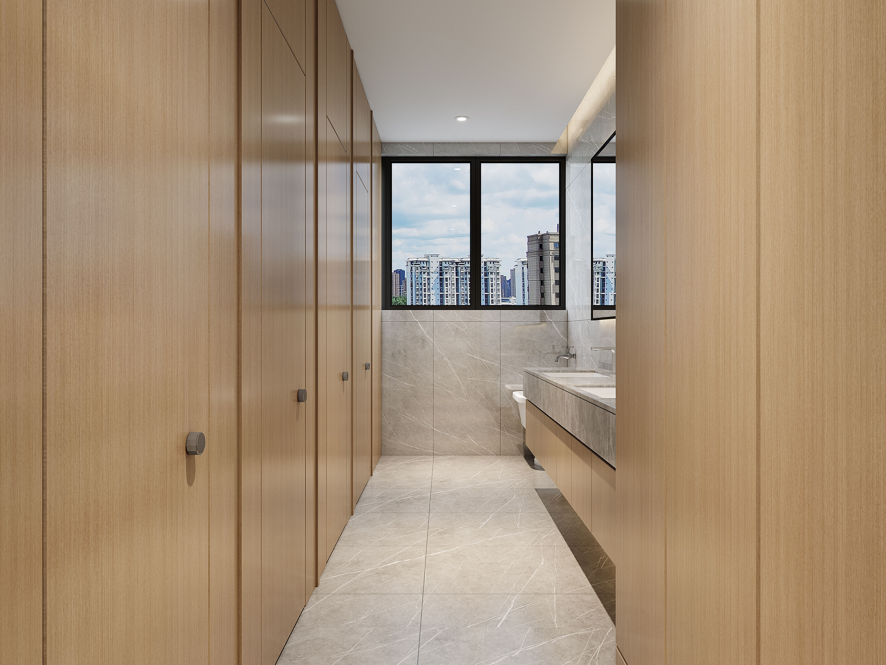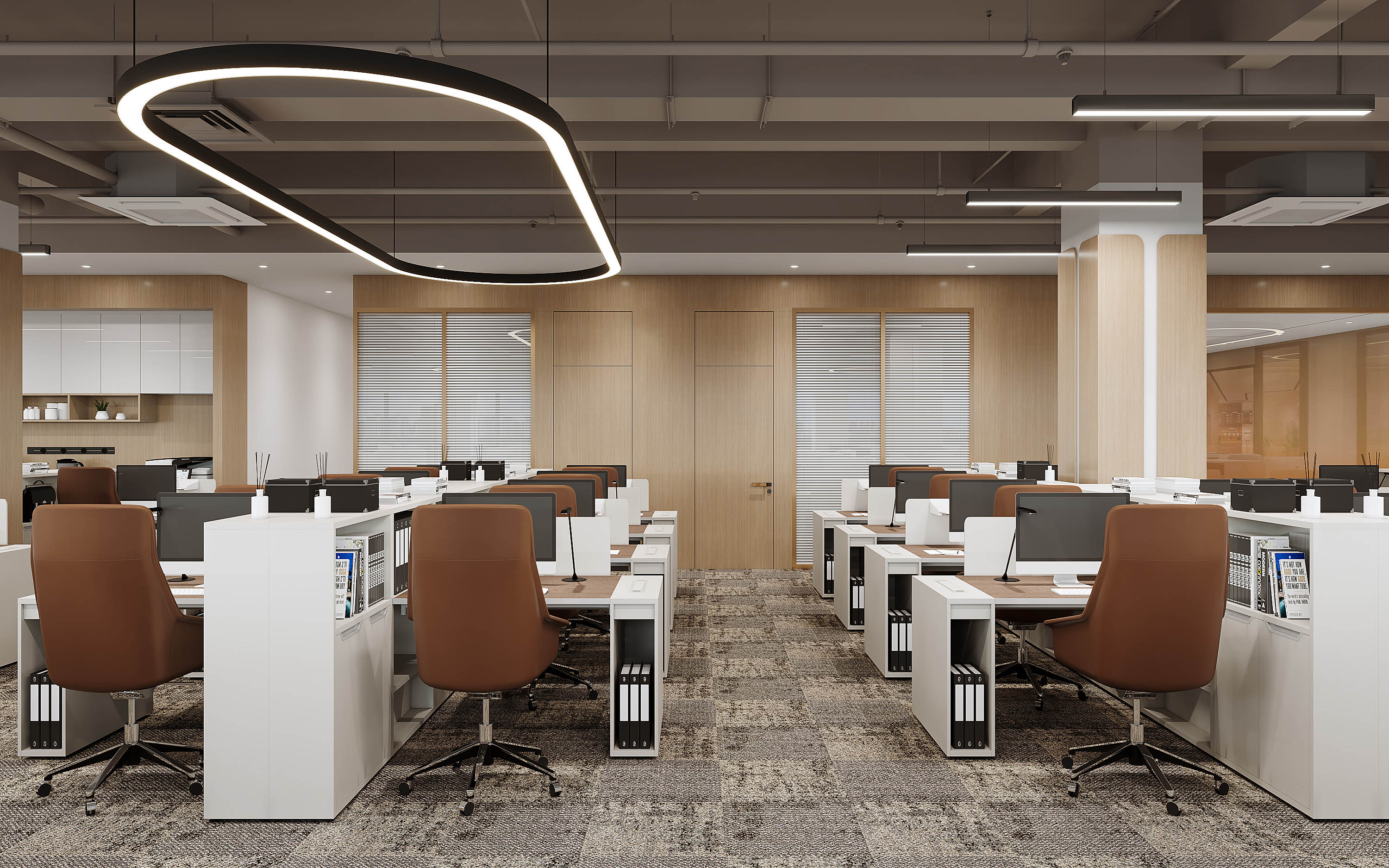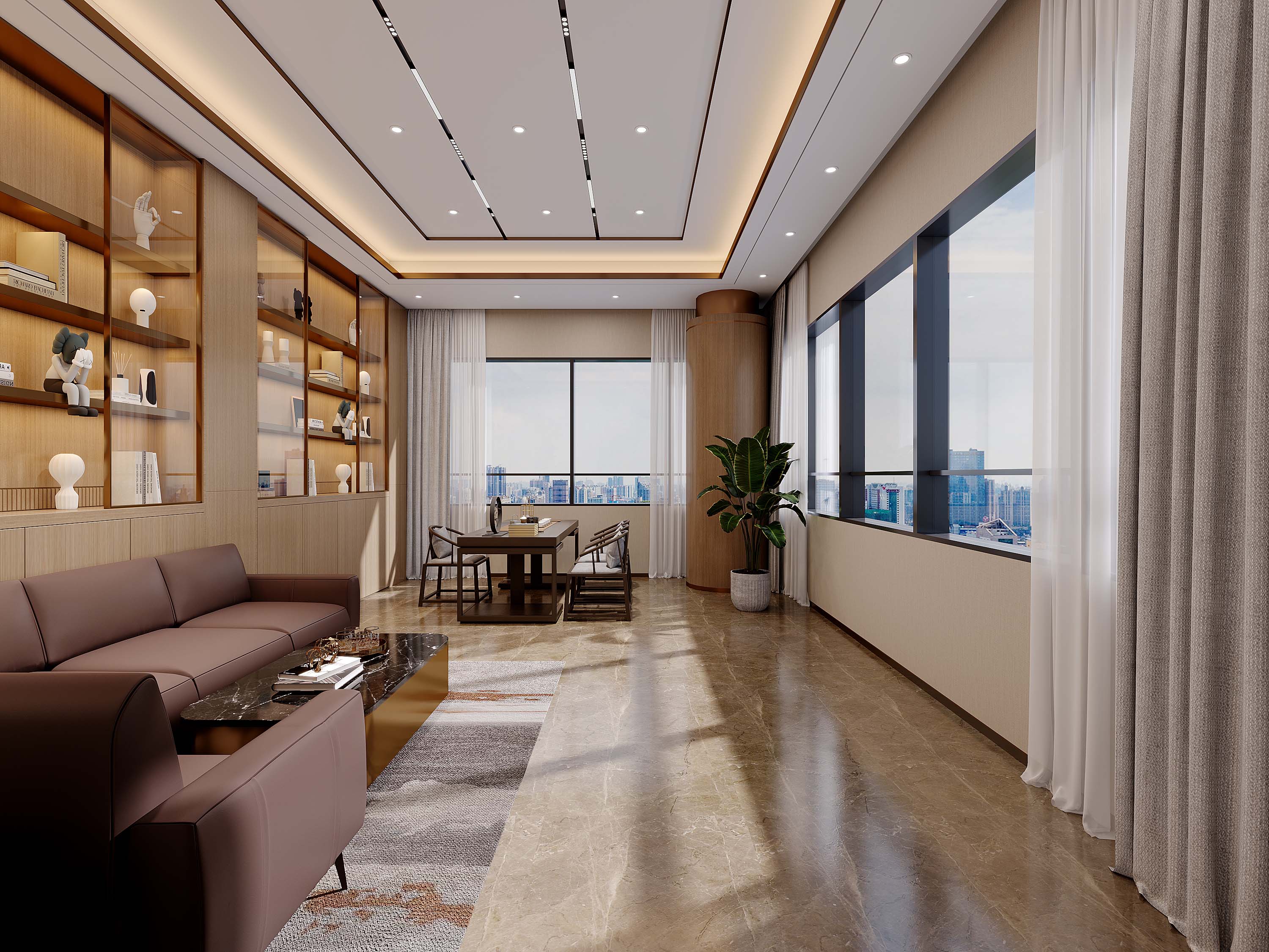 弧形前台搭配渐变光影背景,第一眼便传递品牌辨识度;开放办公区采用工业风无主灯设计,通透高效;多功能会议室、直播拍摄室与总裁办公室,覆盖多元办公场景。温润木饰面与大理石、玻璃材质交织,既保障空间质感,又融入人性化细节,为企业打造高效、专业且充满温度的现代化办公场域。