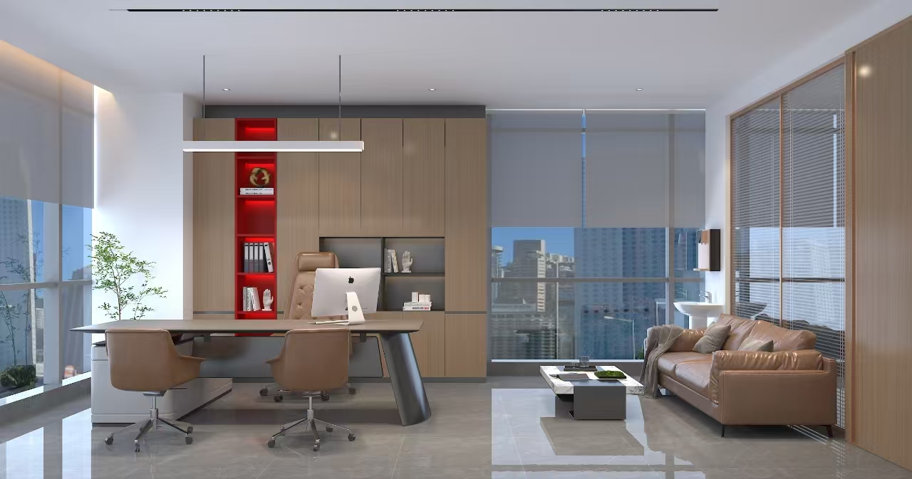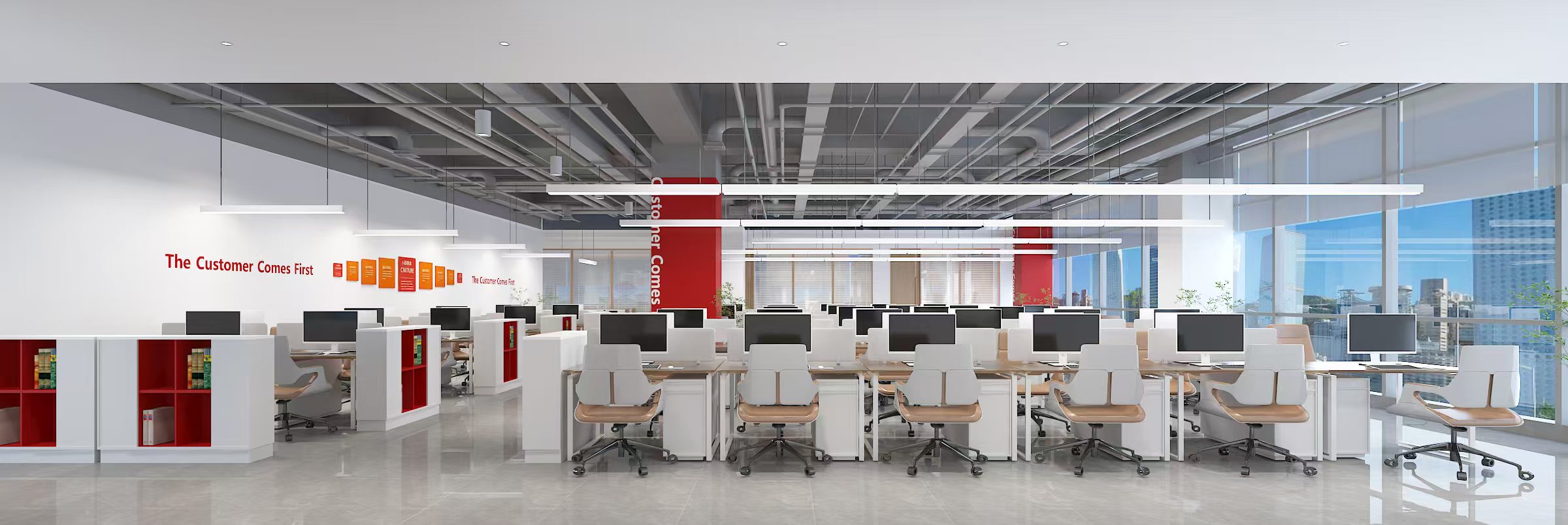 本次办公空间设计,以现代简约风格为主导。前台采用大理石与木质元素结合,展现大气与温暖;茶水间木色柜体搭配艺术挂画,营造舒适休闲氛围;开放办公区通透明亮,红白配色点缀,传递活力与 “客户至上” 理念;会议室简洁大气,满足高效会议需求;总裁办公室则在简约中融入精致软装,平衡办公与休憩功能,整体空间通过材质、色彩与布局的巧妙运用,打造出既专业高效又舒适宜人的办公环境。